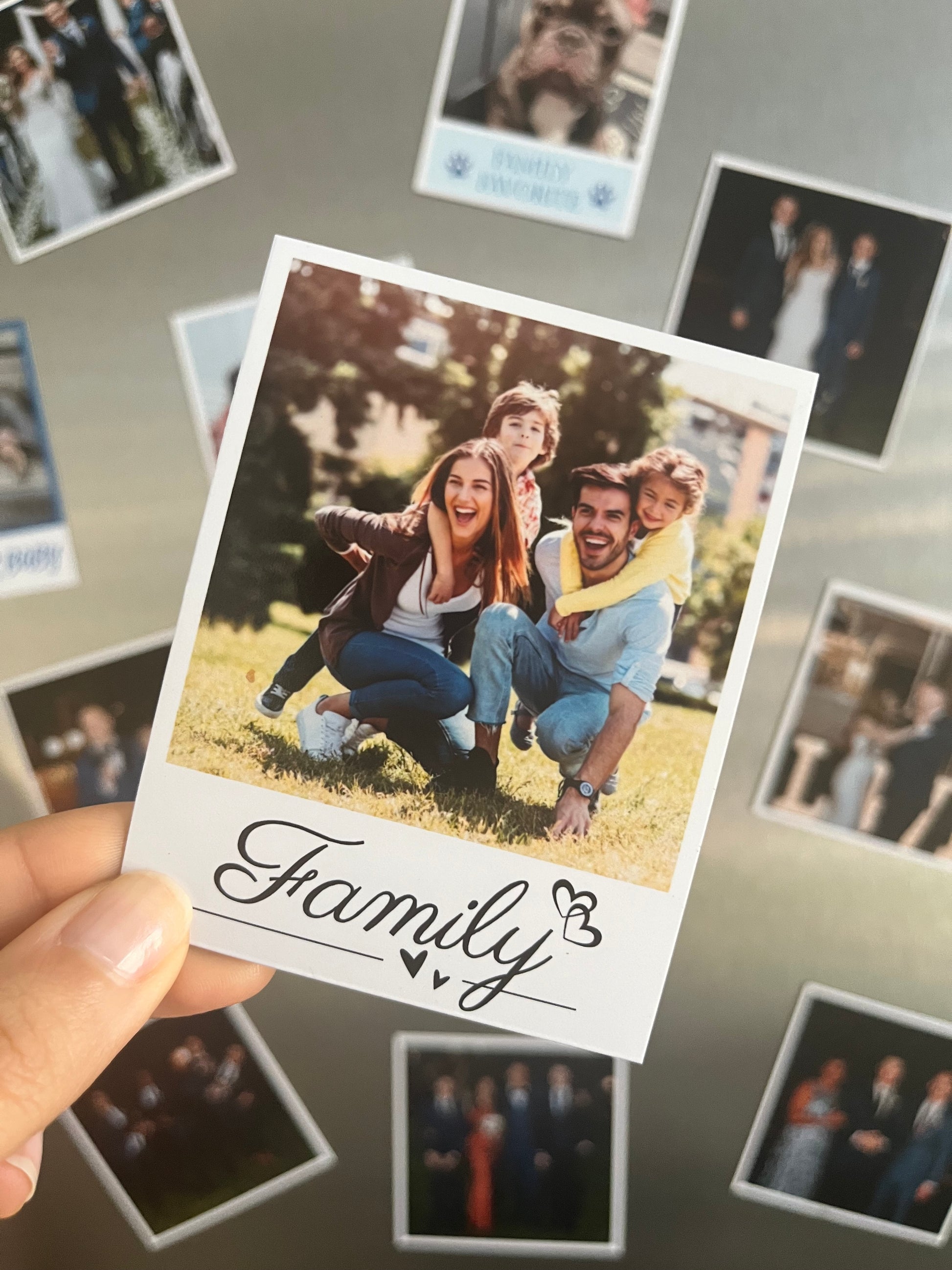 Create a Polaroid style magnet with the word Family in the language of your choice, a simple way to display your favorite memories on your fridge or magnetic board.